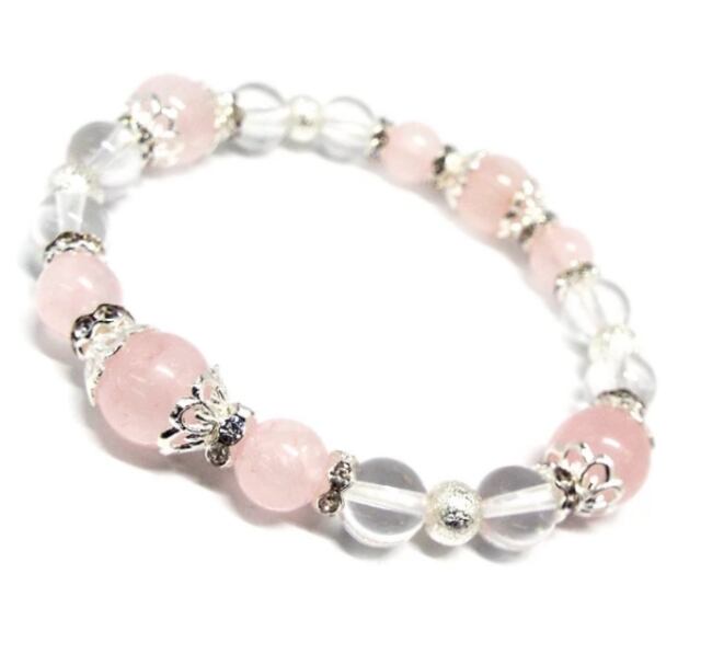 天然石 ローズクォーツ 水晶ブレスレットは、美しいピンク色の淡いローズクォーツと透明感のある水晶が織りなす、優雅で上品な輝きが特徴です。